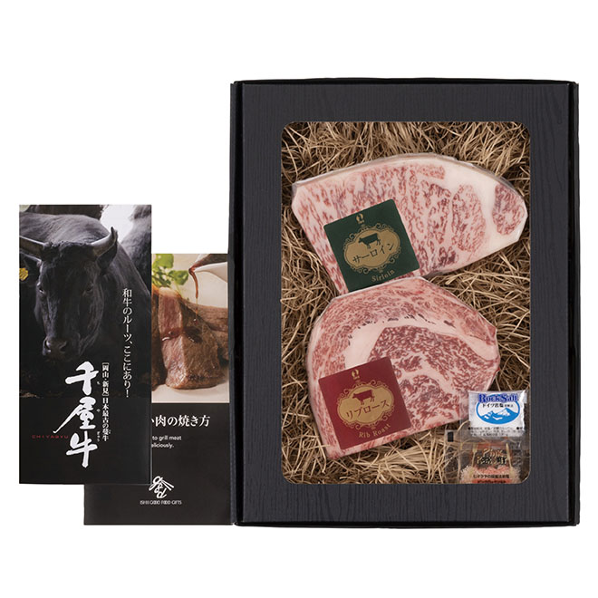 特選千屋牛サーロイン150g、特選千屋牛リブロース150g、ピンク岩塩1g、岩塩1g