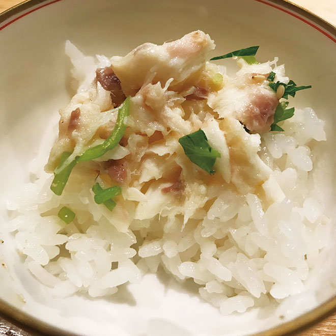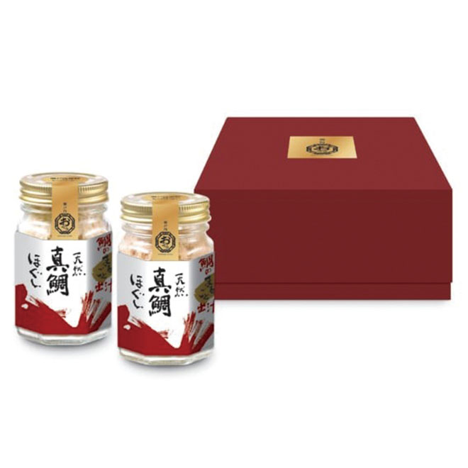 真鯛の骨の髄まで煮溶かした「白湯出汁」であっさりしたほぐし身をに詰め津ことで濃厚な出汁がしみこんだ「天然真鯛ほぐし」です。ご飯のお供にぴったりです。