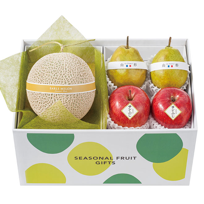 アールスメロン(熊本県または長崎県産)約1.3kg×1、ラ・フランス(山形県産)約250g×2、サンふじ(青森県産)約250g×2