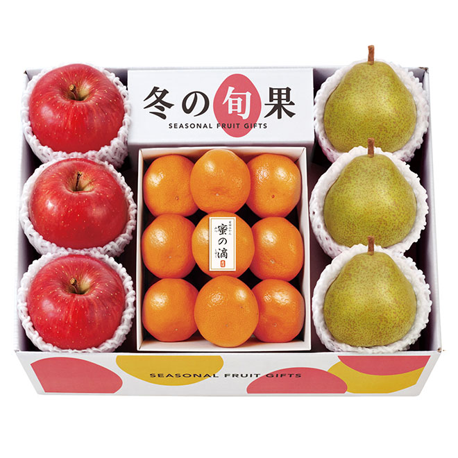 甘さと酸味のバランスが良い青森県産サンふじ林檎と、なめらかでとろけるような甘さが自慢の山形県産ラ・フランス。みかんの本場、和歌山県有田産の自信作「蜜の滴」。旬の味覚を楽しめるフルーツギフトです。※天候により出荷時期が前後する場合がありますので着日指定はお受けできかねます。