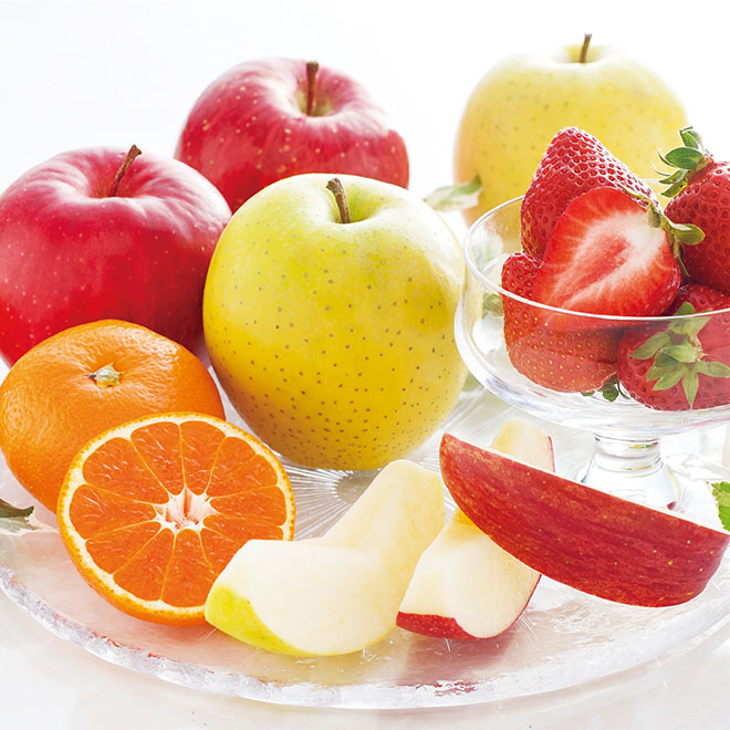 サンふじ(青森県産)・ラ・フランス(山形県産)×各3、蜜の滴SもしくはMサイズ(和歌山県産)約1kg